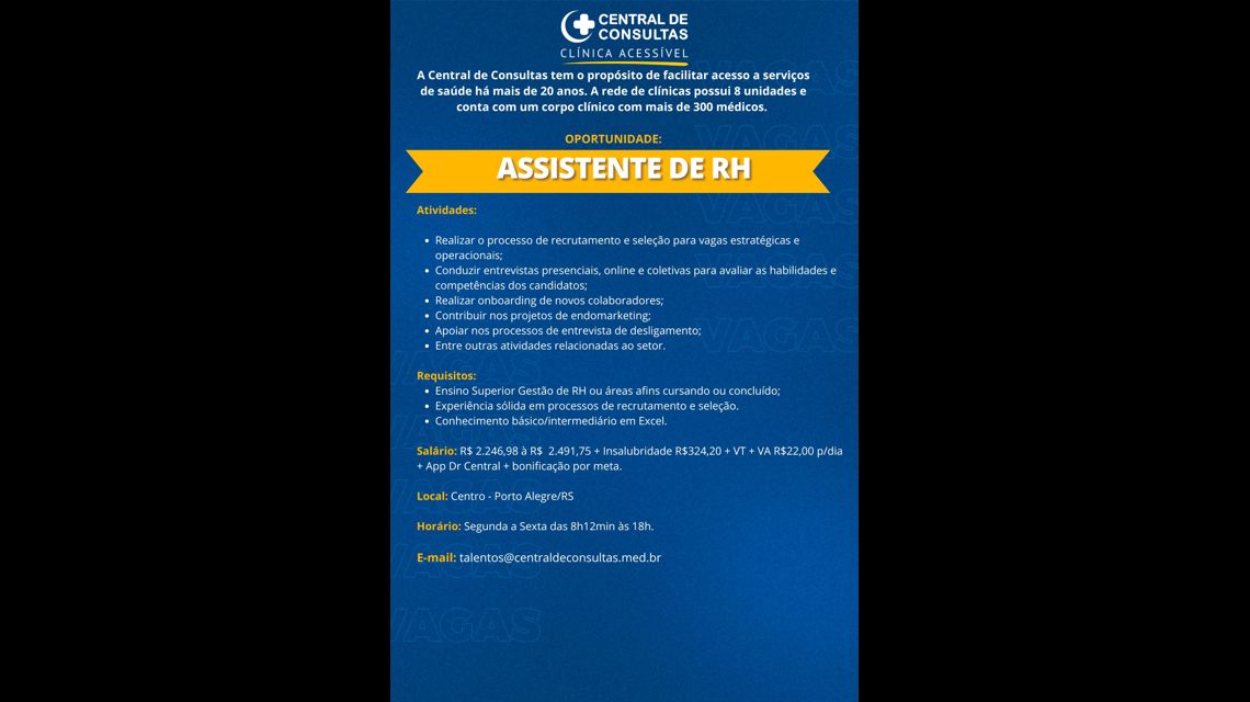 Salário fixo + Insalubridade R$324,20 + VT + VA R$22,00 p/dia + App Dr Central + bonificação por meta.